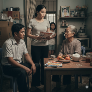 Chồng tôi ngồi im, hai vai so lại. Anh tránh ánh mắt của mẹ, cũng tránh luôn ánh mắt của tôi. Tôi hiểu. Anh kẹt giữa hai người phụ nữ, mà cả hai đều đang cần anh đứng về phía mình.