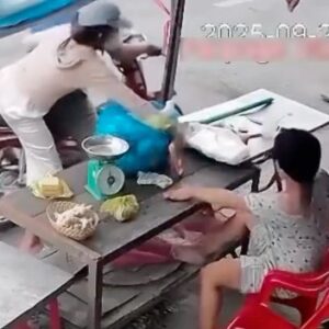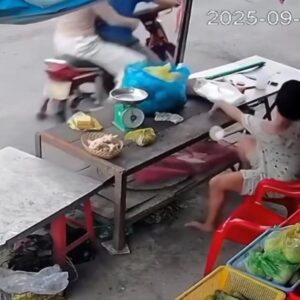 Hình ảnh bà T. (46 tuổi, ngụ phường Long An, Tây Ninh) ngồi bán rau quả bị đôi nam nữ cướp giật điện…