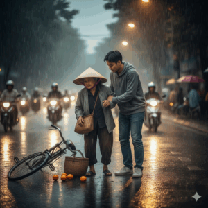 Chiều hôm đó, một cơn mưa lất phất phủ lên thành phố, khiến con đường trở nên trơn trượt và bảng lảng hơi…