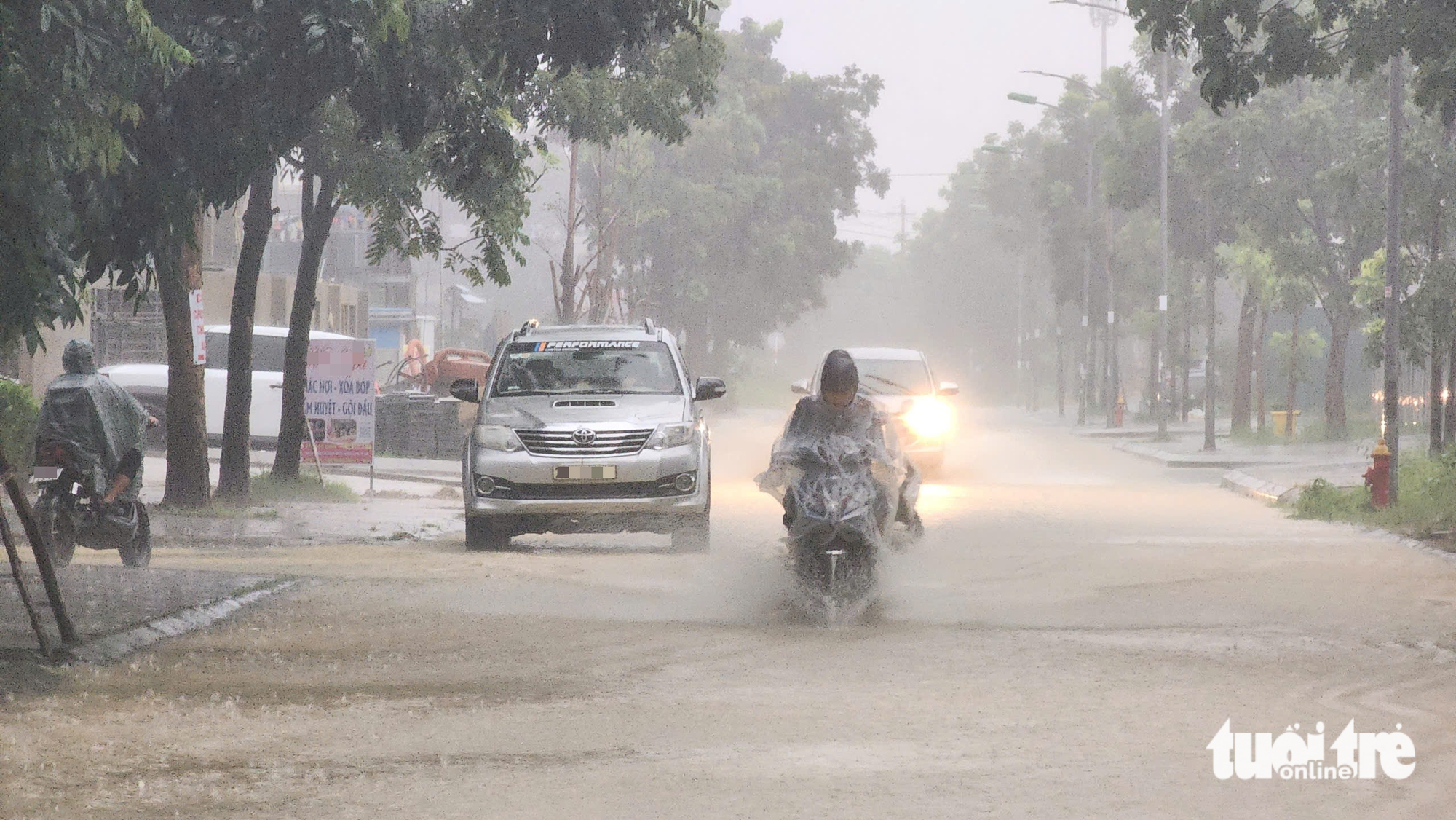 Lúc này ở Huế đang mưa rất to do ảnh hưởng của bão Bualoi. Nhiều đoạn đường Nguyễn Hữu Cảnh ngập sâu.