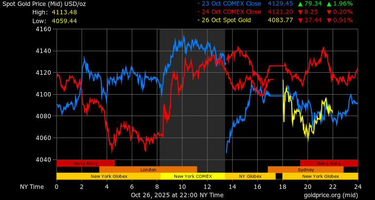 Trên thị trường vàng thế giới, giá vàng giao ngay chốt phiên cuối tuần qua tại Mỹ giảm 12 USD, tương ứng giảm 0,29% xuống mức 4.114,1 USD/ounce. Sang phiên châu Á sáng nay, giá vàng tiếp tục giảm 34,7 USD xuống 4.079,5 USD/ounce.