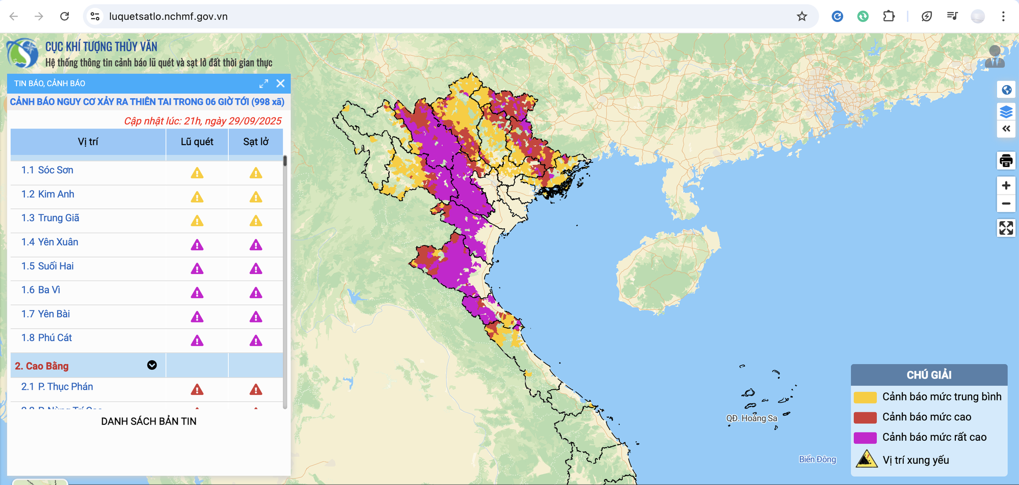 Các chuyên gia khí tượng đưa ra cảnh báo trong 06 giờ tới, nguy cơ xảy ra lũ quét trên các sông, suối nhỏ, sạt lở đất trên sườn dốc tại nhiều xã/phường. (Xem tại đây)