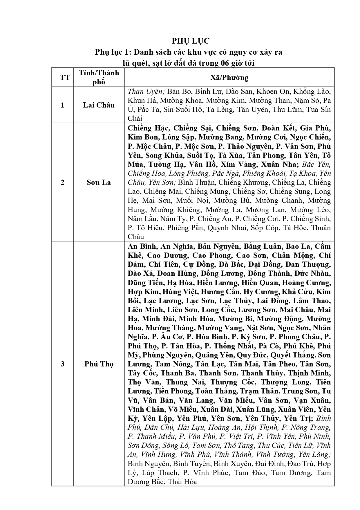 Chi tiết các xả phường có nguy cơ xảy ra lũ quét, sạt lở dất trong 6 giờ tới.