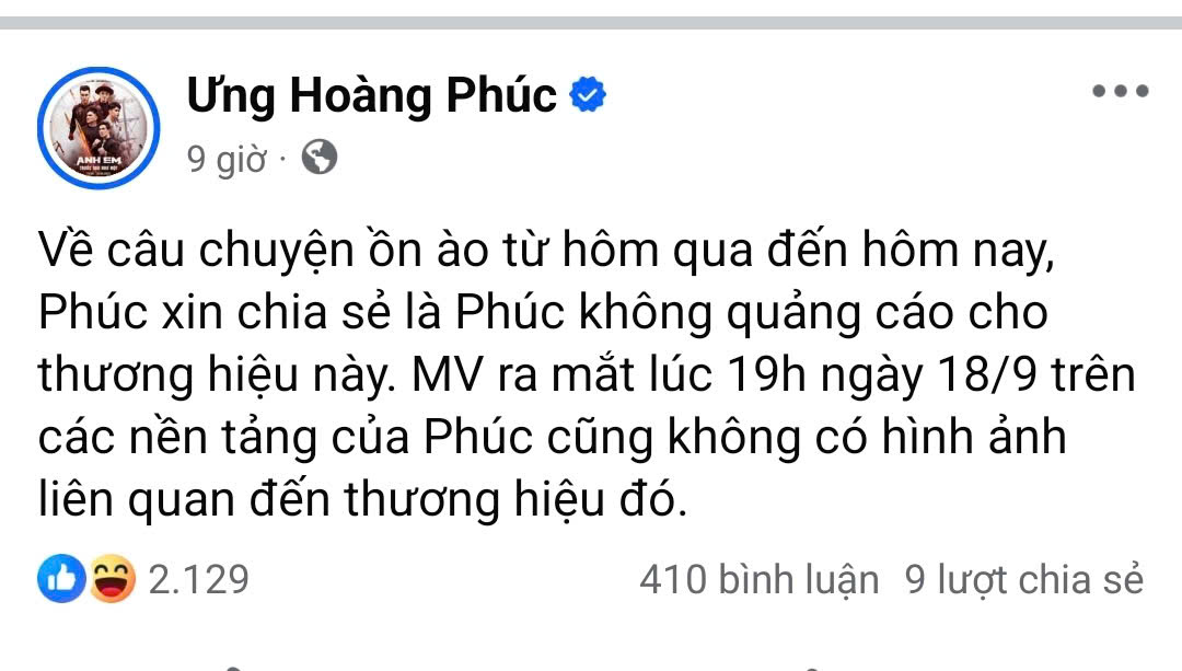 Trên trang Facebook có tick xanh, ca sĩ Ưng Hoàng Phúc chia sẻ: “Về câu chuyện ồn ào từ hôm qua đến hôm nay, Phúc xin chia sẻ là Phúc không quảng cáo cho thương hiệu này. MV ra mắt lúc 19h ngày 18/9 trên các nền tảng của Phúc cũng không có hình ảnh liên quan đến thương hiệu đó”.