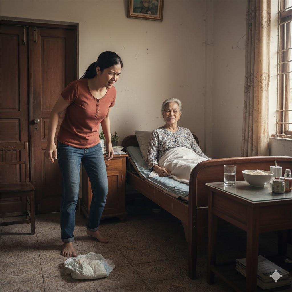 Tôi tên là Mai, 32 tuổi, nhân viên kế toán trong một công ty xây dựng. Chồng tôi – Hùng – là kỹ sư thường phải đi công tác dài ngày. Từ ngày ba anh mất vì đột quỵ, mẹ chồng – bà Liên, 71 tuổi – dọn về sống cùng chúng tôi. Một năm sau, bà bị ngã cầu thang, liệt nửa người, việc chăm sóc chủ yếu dồn lên vai tôi.