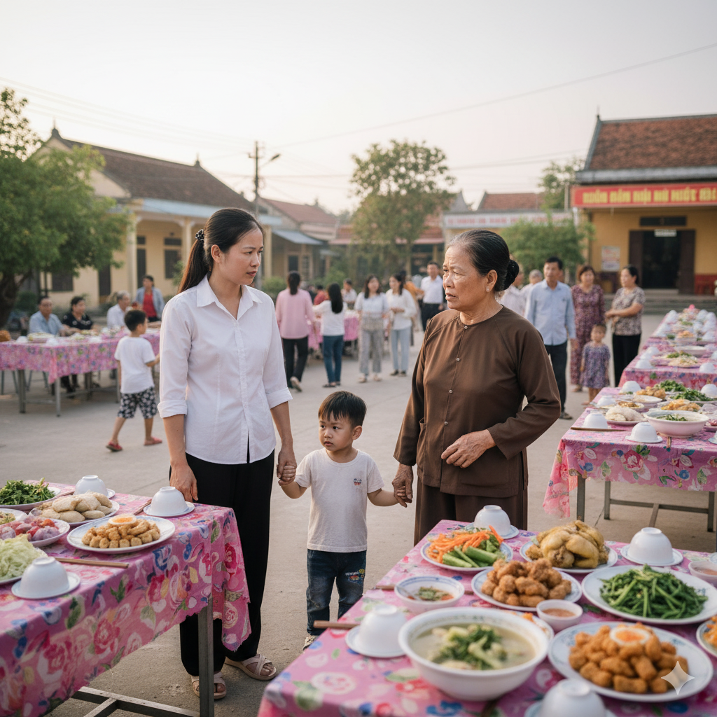 Tôi nghe rõ tiếng mấy người chú trong mâm khẽ “hừ” một tiếng. Một người cười gượng. Một người cúi xuống gắp miếng thịt để giả vờ không nghe thấy. Hai đứa con tôi đứng im, mắt nhìn tôi chờ phản ứng.