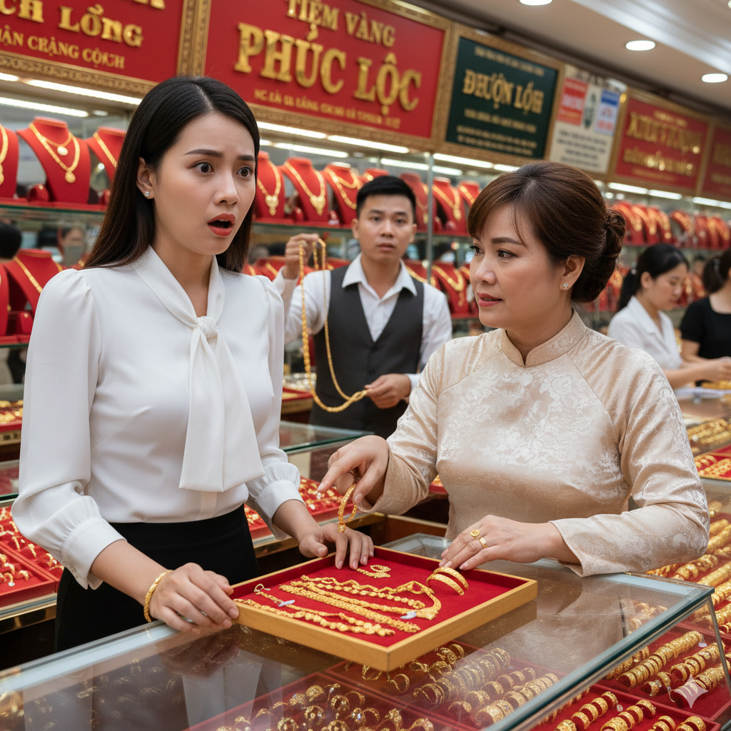 Cô bán hàng mang ra một hộp nhung. Bác Lệ mở nắp, ánh vàng hắt lên gương mặt bà. Đó là đúng mẫu nhẫn tôi vừa chọn.