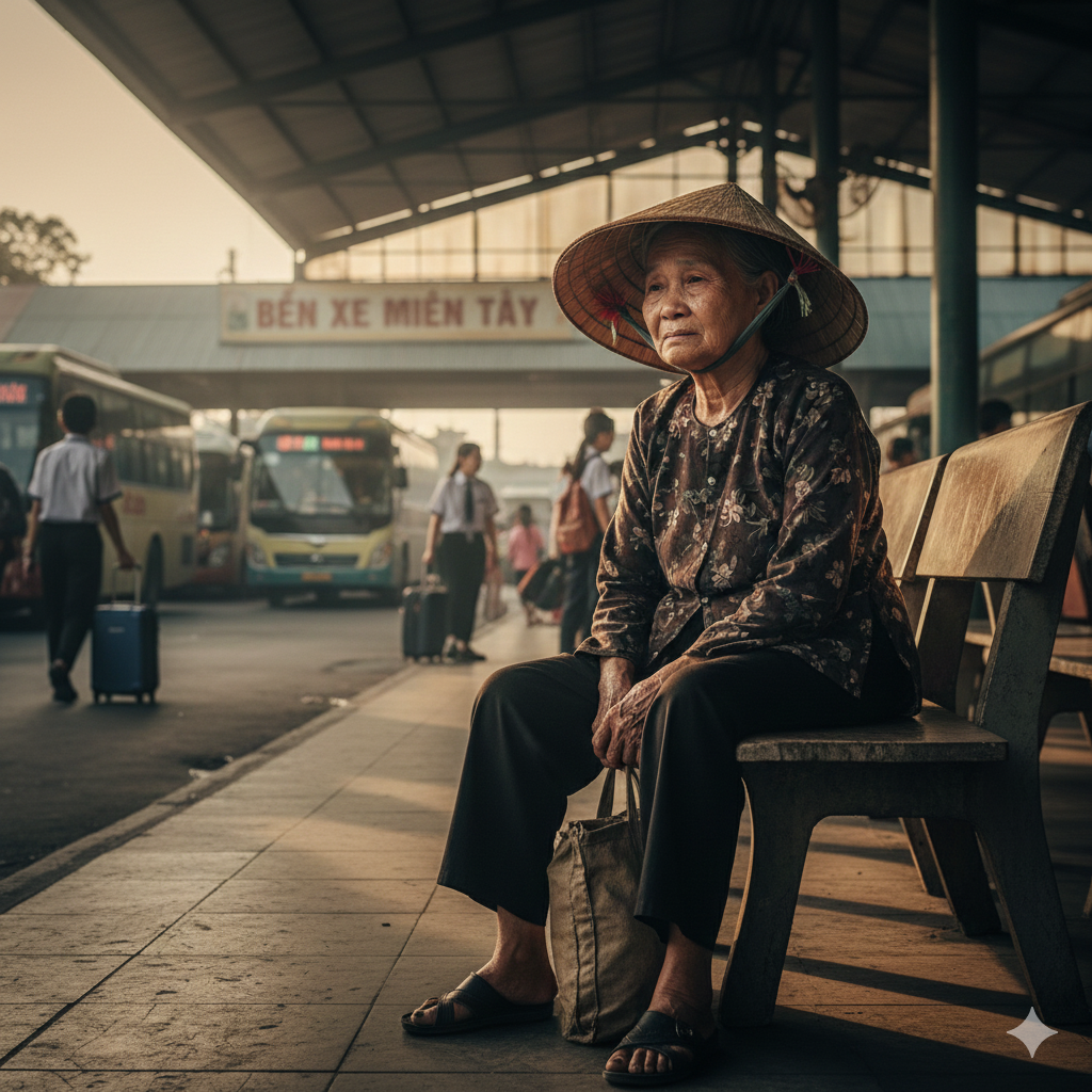 Bà đến từ lúc bốn giờ kém mười, khi bến xe còn chưa mở cổng chính. Bà không chen vào mua vé, cũng không hỏi han ai. Bà chọn đúng cái ghế nhựa xanh sứt một góc, nằm chếch bên hông bến, quay mặt ra lối xe ra vào.