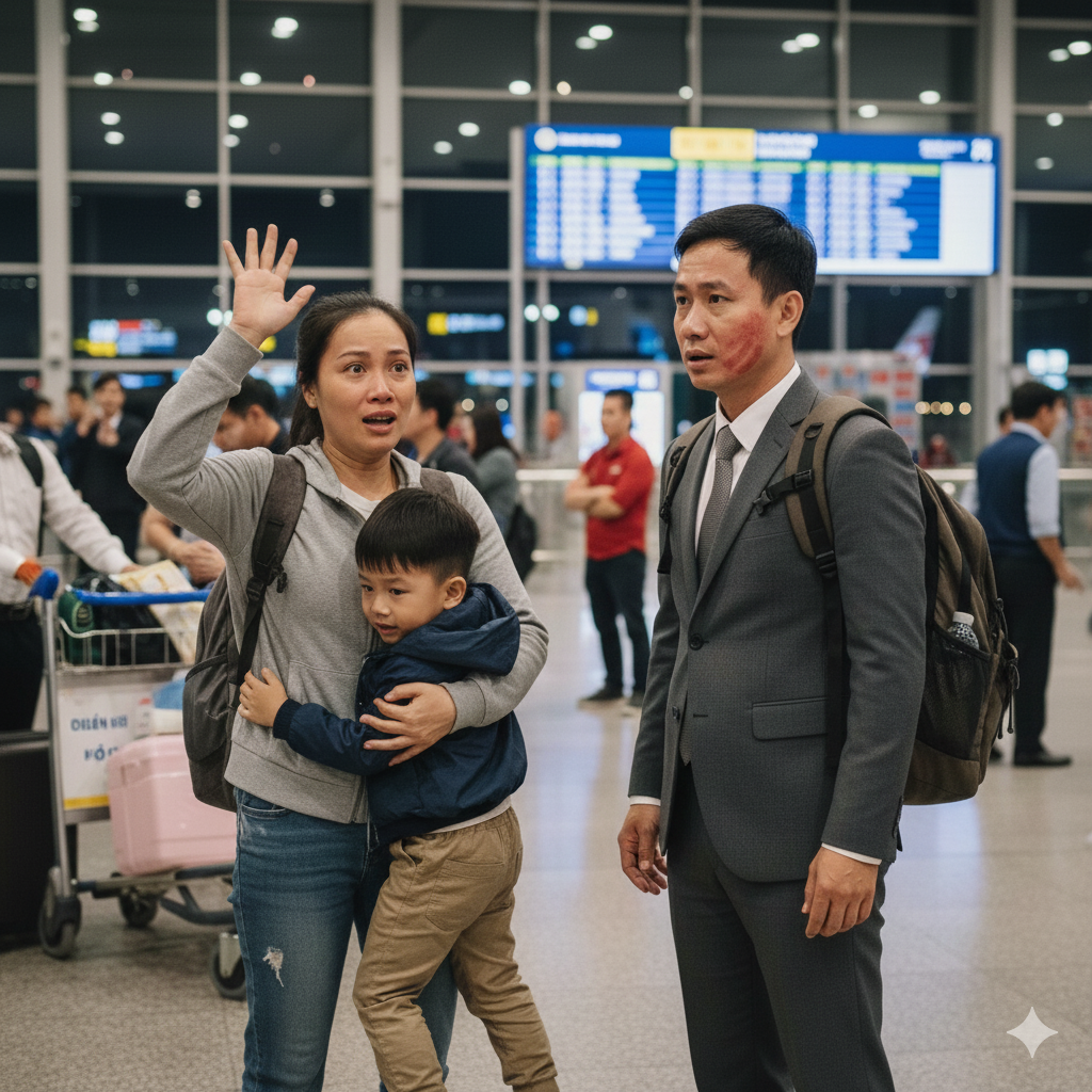 Tôi không suy nghĩ, bàn tay theo bản năng tát mạnh vào mặt anh ta. Tiếng “chát!” vang lên giữa khu vực nhận hành lý đông nghẹt.