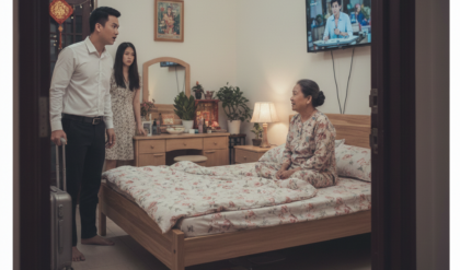 Nhưng chỉ trong một giây, tay anh trượt khỏi cần kéo vali, chiếc vali đổ rầm xuống sàn. Gương mặt anh tái mét, môi mím chặt, cổ họng khẽ chuyển động như nuốt phải thứ gì đó rất đắng.