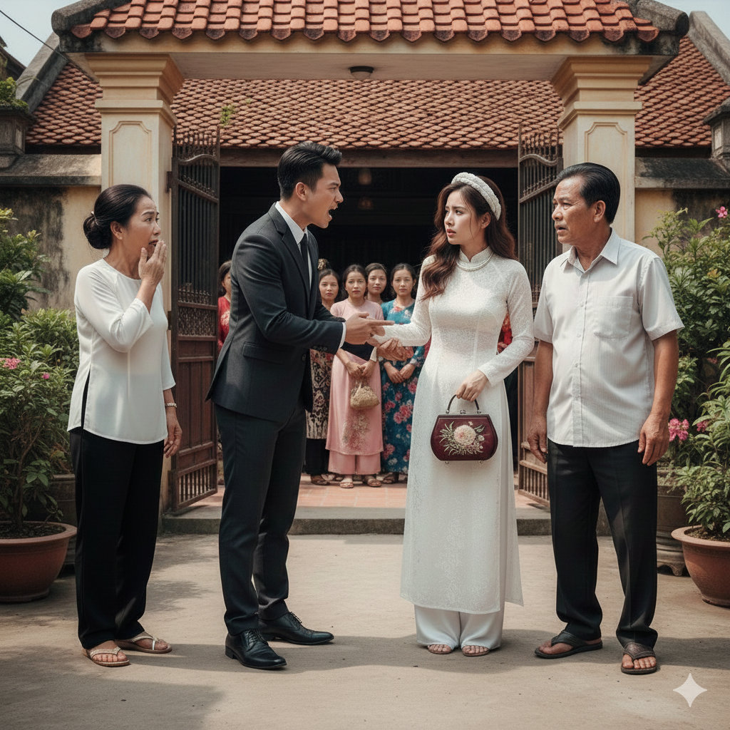 Khải đứng giữa sân, vẻ mặt lạnh tanh. Anh ném chiếc vali của Hân xuống đất, kéo tay cô từ trên xe.