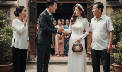 Khải đứng giữa sân, vẻ mặt lạnh tanh. Anh ném chiếc vali của Hân xuống đất, kéo tay cô từ trên xe.