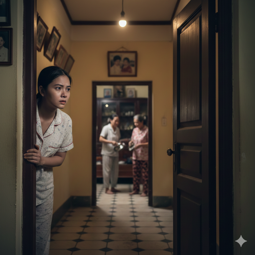 Hành lang tối om, chỉ có ánh sáng vàng từ bóng đèn cuối dãy. Tôi bước từng bước, bàn chân run vì lạnh. Đến trước cửa phòng bố mẹ chồng, tôi nín thở.