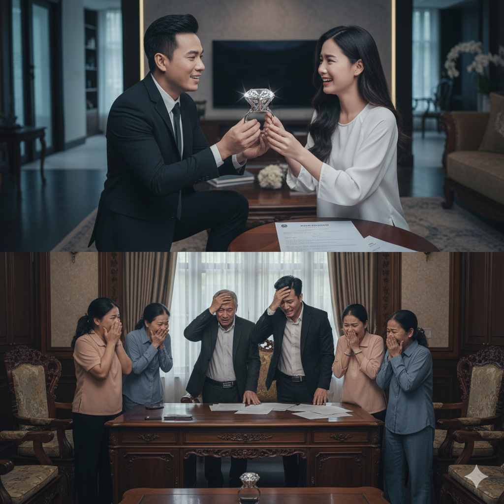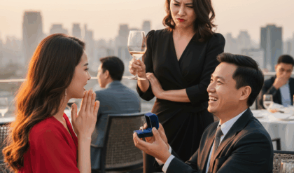 Tối đó, trong nhà hàng hải sản sang trọng, Khôi quỳ xuống, mở hộp nhẫn kim cương to như ngón tay cái. Một viên đá cắt sáng rực rỡ, ước tính phải 3 tỷ.