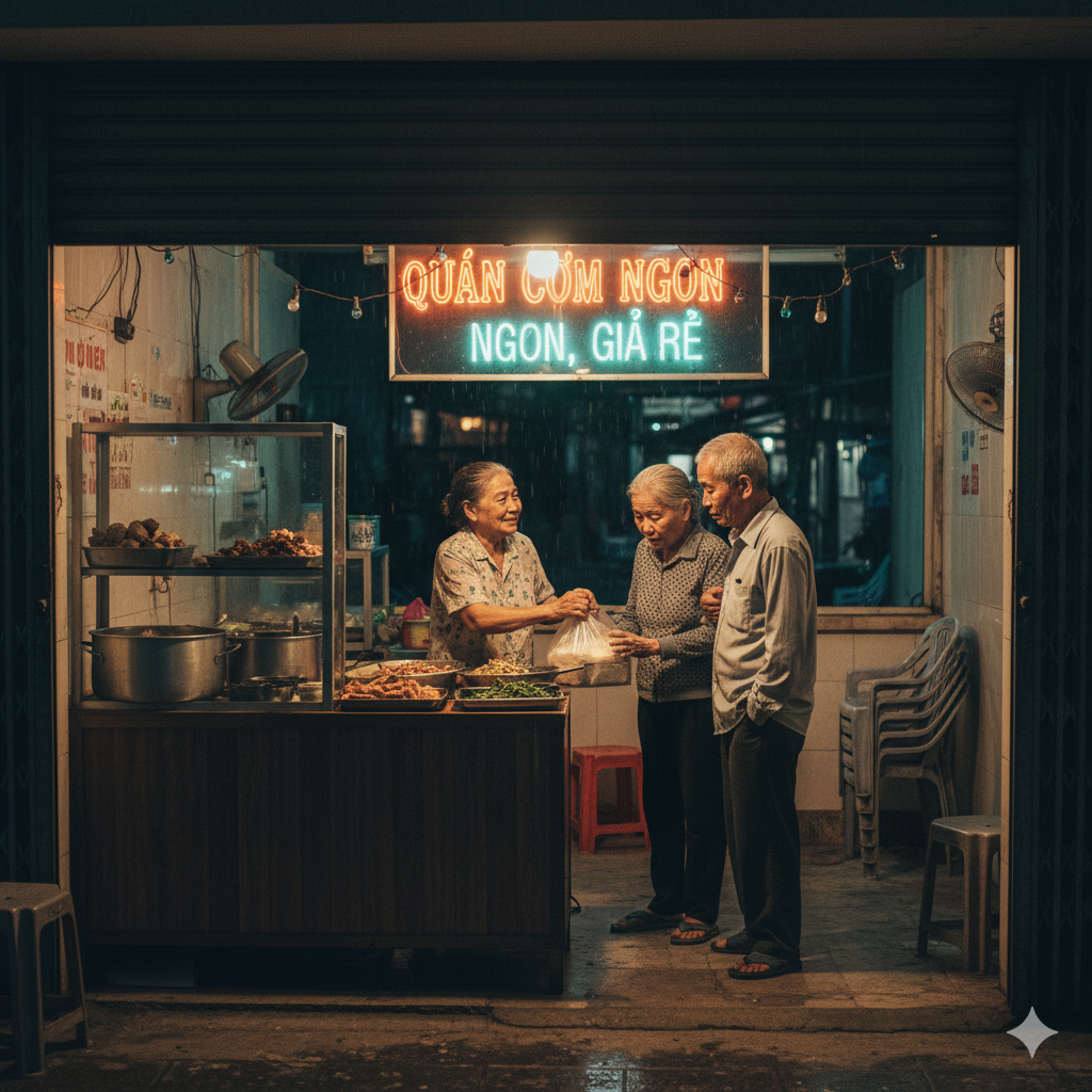 Quán cơm nằm cuối con hẻm nhỏ, bảng hiệu đã bạc màu vì nắng gió, bóng đèn tuýp trên trần chớp nháy từng hồi như hơi thở của người thoi thóp. Bà Hạnh đứng trước nồi cơm đang vơi, tay khẽ run. Đã ba ngày rồi, bà chỉ bán được chưa tới mười suất.