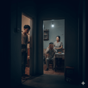 Ánh đèn hành lang hắt lên tấm bảng gỗ treo trước phòng thờ: “Gia đình hạnh phúc.” khiến tôi bật cười