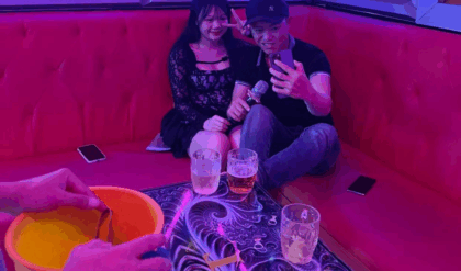 Ban ngày chỉ là căn nhà cấp bốn với tấm biển cũ kỹ, nhưng về đêm lại sáng rực ánh đèn đỏ, tiếng nhạc xập xình, tiếng cười nói nhòe trong khói thuốc.