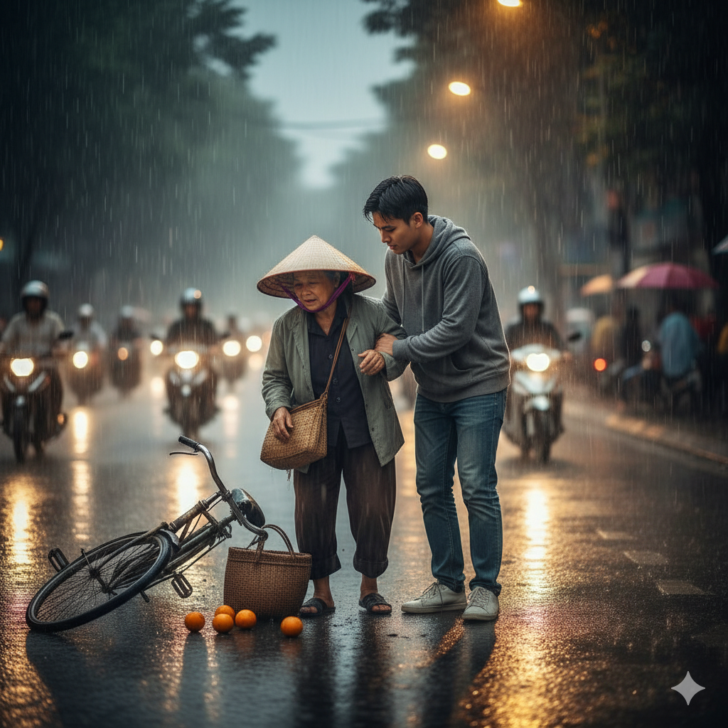 Hoàng thắng gấp. Dưới ánh đèn đường vàng vọt, cậu thấy một chiếc xe đạp nằm nghiêng, và một bà cụ lớn tuổi đang nằm co ro bên lề đường, tay ôm lấy chân một cách đau đớn. Bên cạnh bà là chiếc túi vải nhỏ bị bung ra, mấy quả cam lăn lóc trên mặt đường.